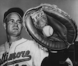 ![]() Clint Courtney tries on an oversized catcher's mitt. |